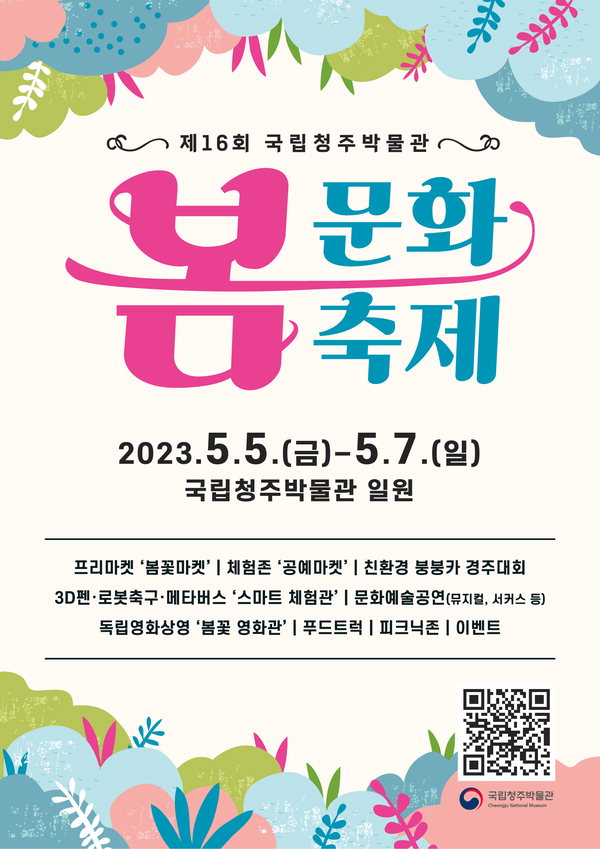 국립청주박물관『제16회 봄문화축제』 기간: 2023.5.5.(금) ~ 5.7.(일) 장소: 국립청주박물관 일원 ※본 행사 일정 및 공연은 날씨와 박물관 사정에 따라 변경 또는 취소될 수 있습니다.