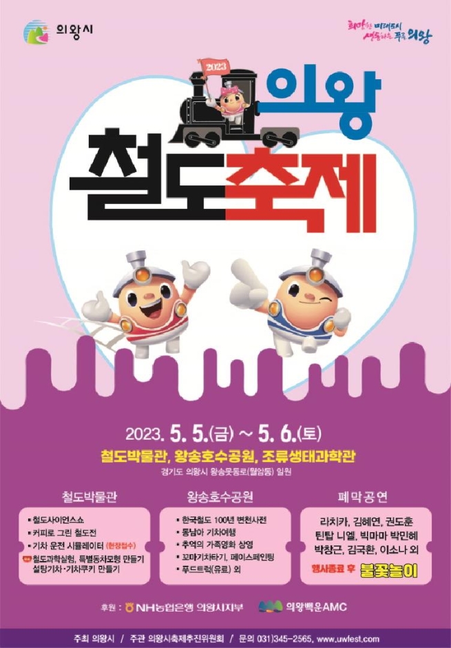 의왕시민과 함께하는 2023 의왕철도축제일시 : 5월 5일 (금) ~ 6일 (토) 장소 : 왕송호수공원/철도박물관(무료입장)/조류생태과학관